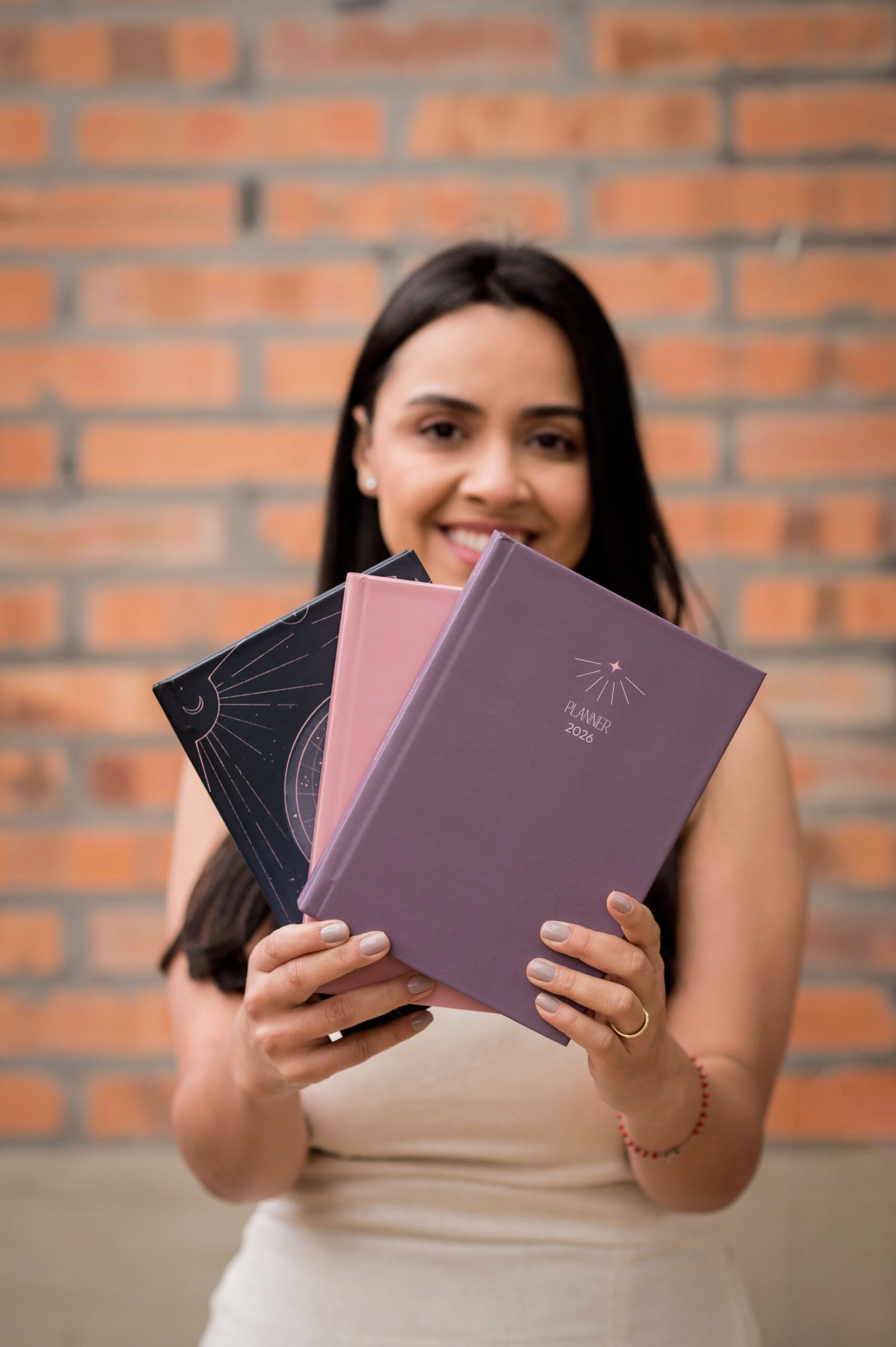 340 páginas – 3 versões: Rosa (escrito Planner 2026), Roxo (escrito Planner 2026), e Azul Marinho com estampa em rosê e branco (escrito Astro Planner 2026)