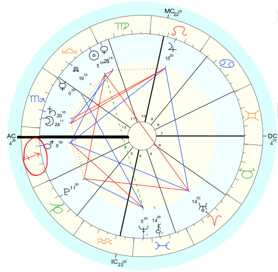 Neste mapa abaixo, o ascendente é o signo de Sagitário , pois a casa 1 está cortando aos 4 graus desse signo.